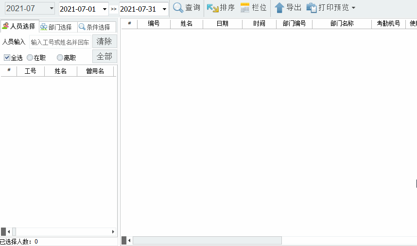 查询任意人员之前,请先清除已经选择的人 选取所有人员 选取单个/部分人员 通过输入工号/姓名,输入工号/姓名 按回车 直接用鼠标选取 按部门选取 多条件查询文档更新时间: 2023-09-02 16:43 作者:admin